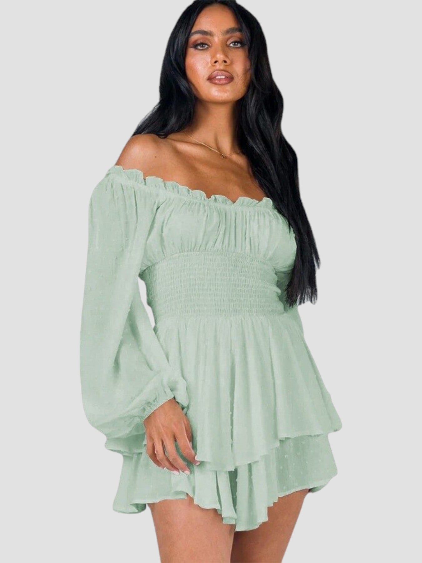 Let your feminine side shine with Allegra – the off-shoulder dress that combines charm and lightness with a touch of romance. The puff sleeves, stretchy bodice, and delicate ruffles create a dreamy look that flatters your figure and offers absolute comfort.
